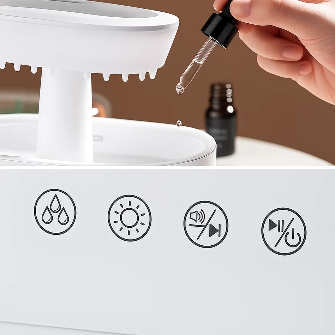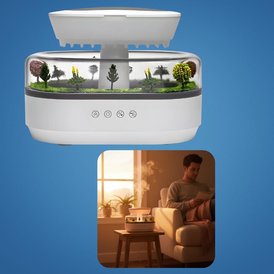 AuraMist combines a soothing humidifier, essential oil diffuser, and LED light in one elegant unit. Its rainfall-inspired mist and nature-simulated landscape create a calming, spa-like ambience. Unlike ordinary humidifiers, it restores air moisture while reducing stress and promoting deep relaxation and better sleep.