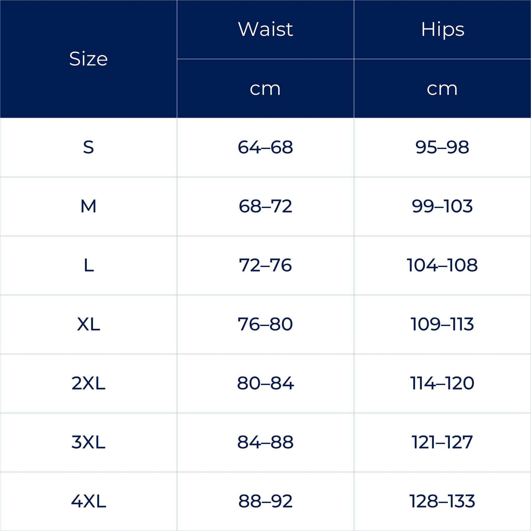 - 4XL fits an 88–92 cm waist and 128–133 cm hips.