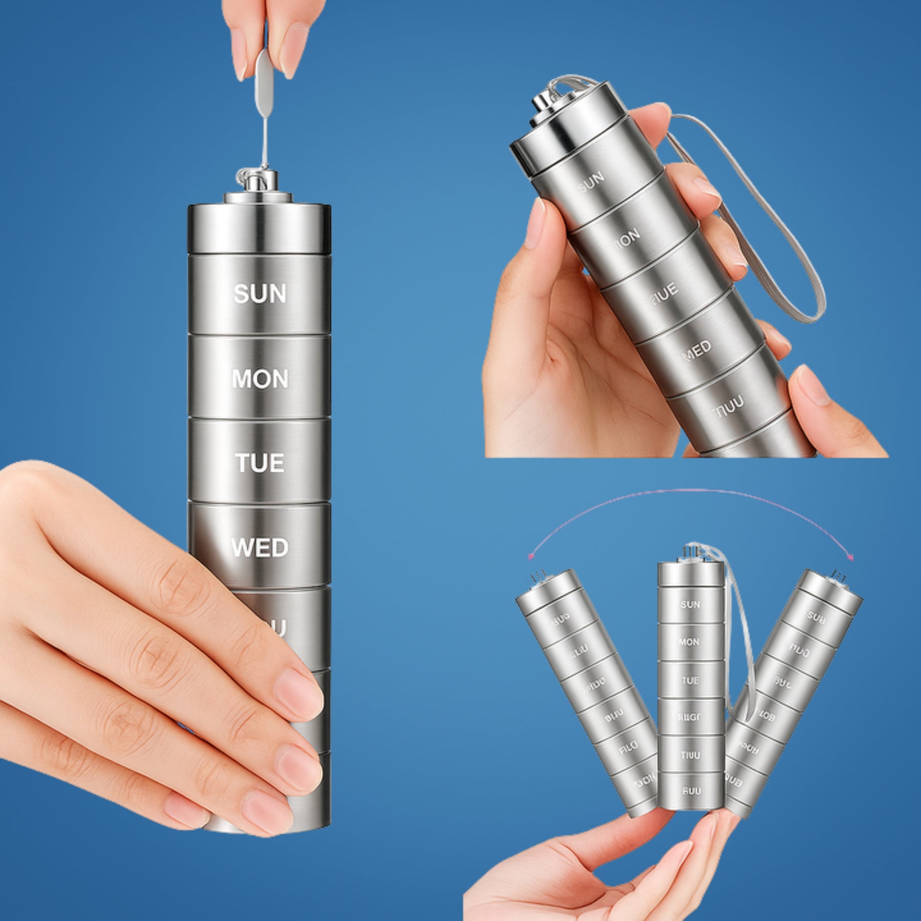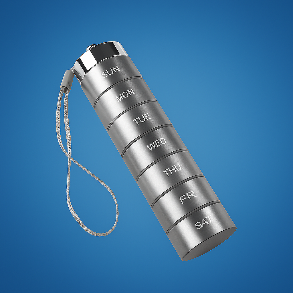 Crafted from high-grade aluminium, the DoseGuard Weekly Pill Organiser is lightweight, durable, and corrosion-resistant. Its smooth finish and moisture-proof seal ensure lasting protection and effortless cleaning.