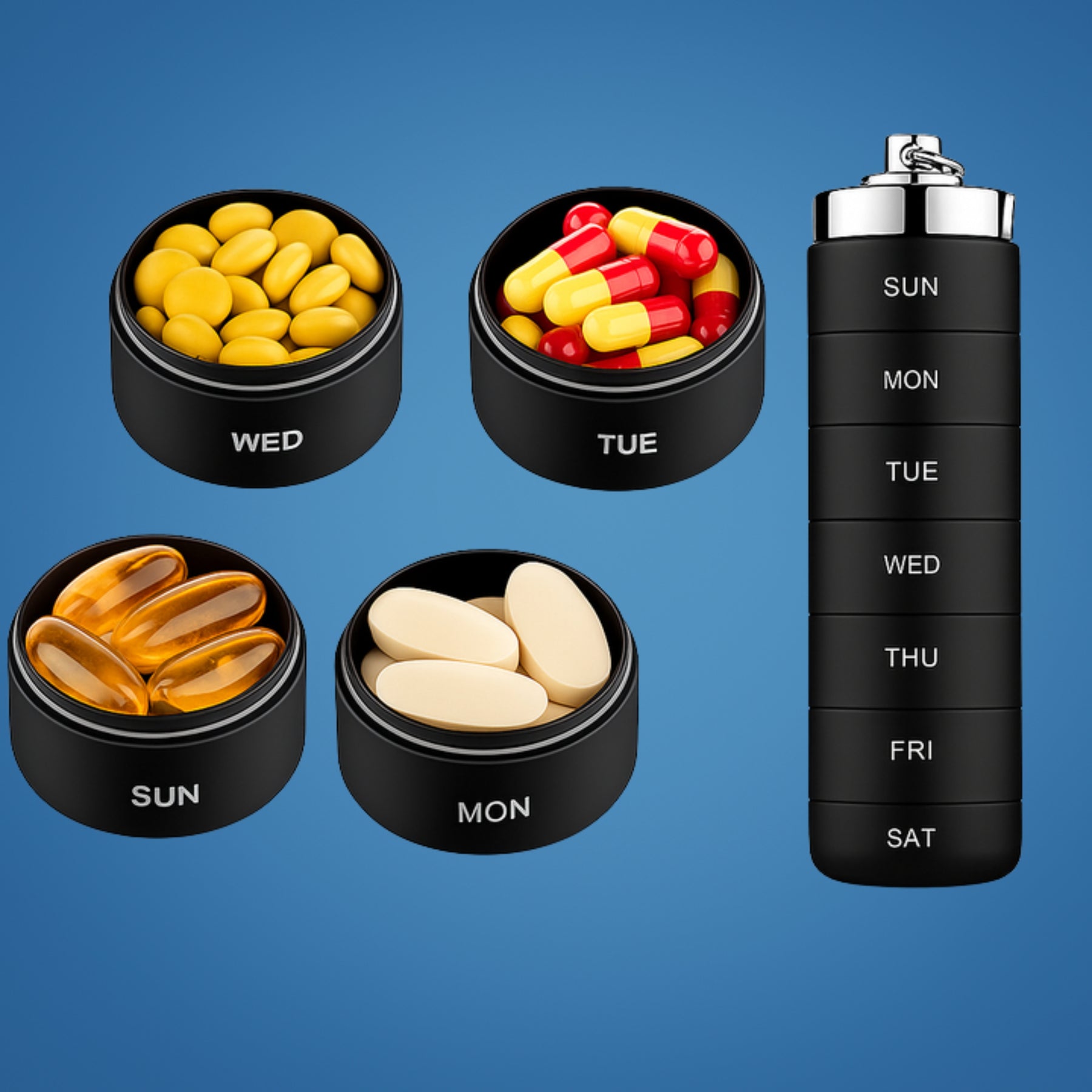 The DoseGuard Weekly Pill Organiser keeps your pills dry, secure, and easy to access. Made from durable aluminium alloy with a waterproof seal and spacious compartments — ideal for home, travel, or adventure.