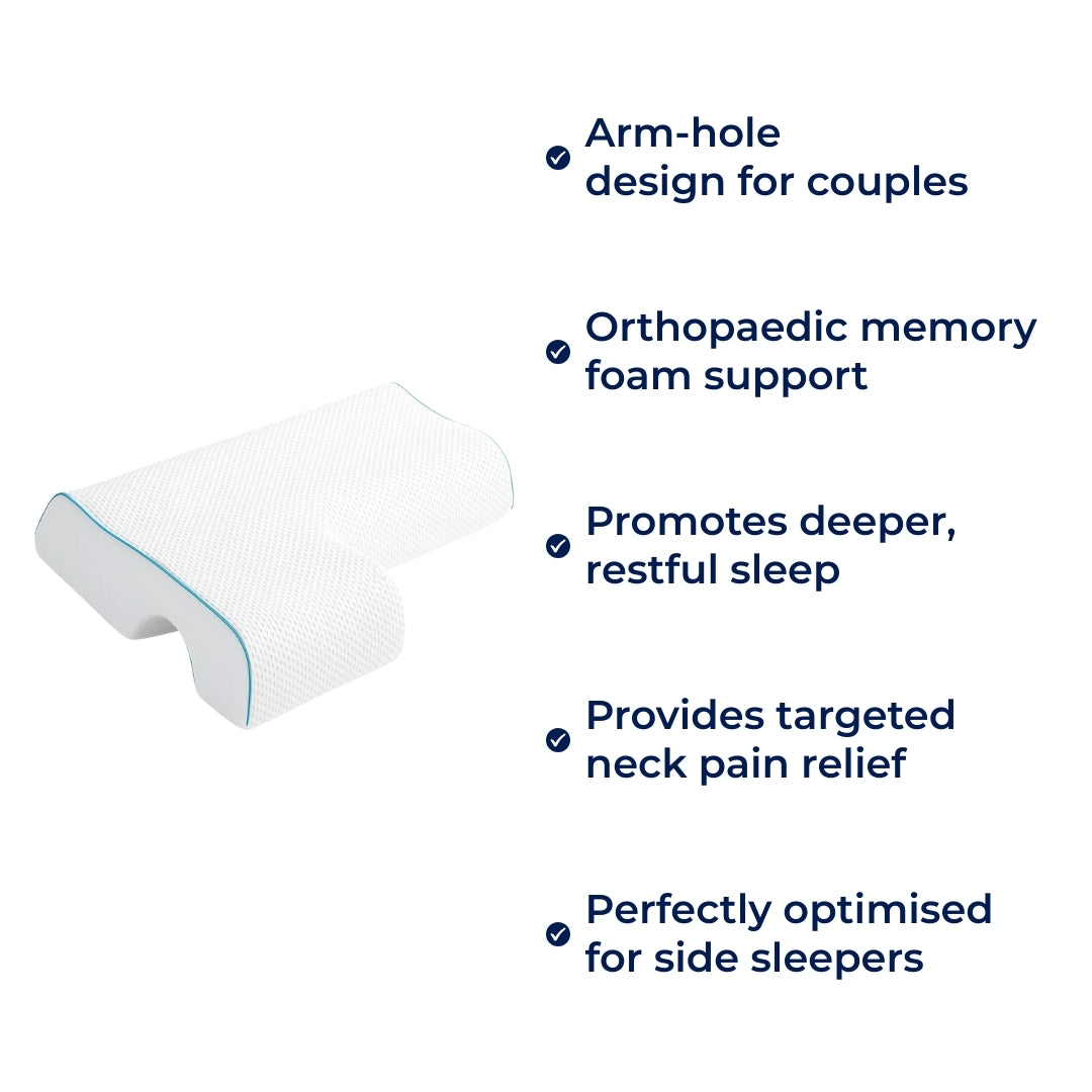 Enjoy pain-free, restful sleep with a pressure-relieving arm tunnel and orthopaedic neck support. The SleepEase Side-Sleeper Couple Memory Foam Pillow is perfect for side-sleeping couples.